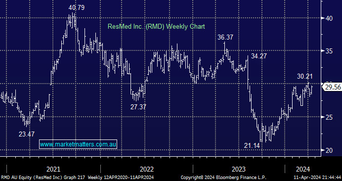RMD rallied +1.5% in a falling market on Thursday, an encouraging move for the sleep disorder business, which has been on a wild Ozempic ride over the last year – unfortunately, overnight trade in the US suggests it will struggle this morning. At MM, we’ve commented on many of RMD’s twists and turns through its volatile journey since many of us first heard about miracle slimming drugs, and after its 43% recovery, the risk/reward is diminishing fast for the bulls.