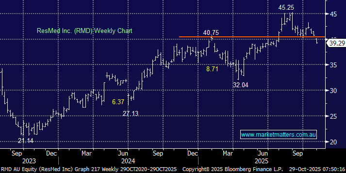 Firstly, this remains an impressive world-class business, but after recovering strongly from Ozempic worries in 2023/4, we must focus on what comes next. We believe there remains ongoing uncertainty around the impact of weight loss drugs over the longer term, and another “wave” of news-driven selling wouldn’t surprise although it’s likely to find support quicker than in 2023. This is not a perfect science, but RMD feels fair value around $40 and wouldn’t be compelling to us unless it continued to decline towards its 2025 lows.