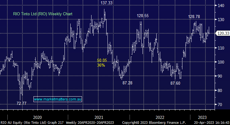 RIO -2.32%: shares in the iron ore miner softened today, though largely traded in line with peers following a mixed 1Q production report. The iron ore front was strong, a record start to the year for Rio which usually sees a seasonally weak March Period. Production was up 11% vs 1Q22, but down -11% vs the prior quarter. Bauxite production was soft on the back of heavy rainfall, but the weakest segment was copper mostly thanks to snowfall at their Kennecott site reducing mine throughput. Escondida production was up 6%, however, they continue to face geotechnical issues at the mine leading to the company downgrading copper guidance by ~10%. Prices remain robust, and cost guidance was maintained.