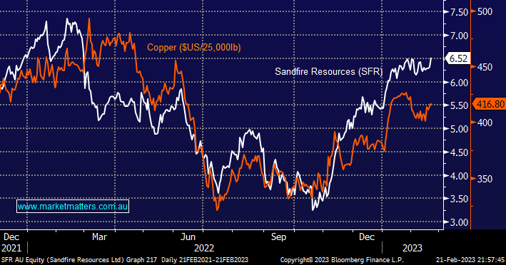 Fund managers like to allocate certain money to different market sectors/themes such as banking, insurance, and iron ore. The issue locally with regards to the copper space is the previous goliath in the room, OZ Minerals (OZL) is in the process of being gobbled up by BHP which leaves SFR as the primary company for Australian investors to gain exposure to the industrial metal hence we can see valuation surprises on the upside during periods of strength for the global economy and Copper – the chart below illustrates how since late 2022 SFR has already been outperforming the copper price.