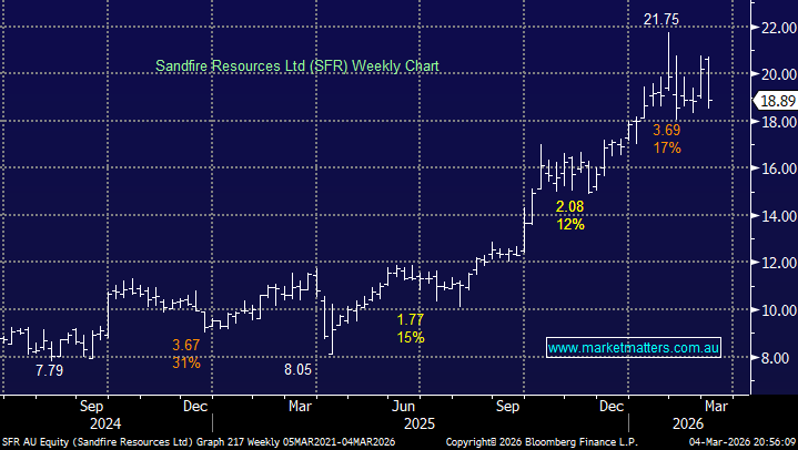 SFR closed 13% below its 2026 high on Wednesday illustrating how miners can be volatile even within an uptrend. At MM we remain bullish towards copper in line with global electrification but a short term pullback towards the $17 area wouldn’t surprise.