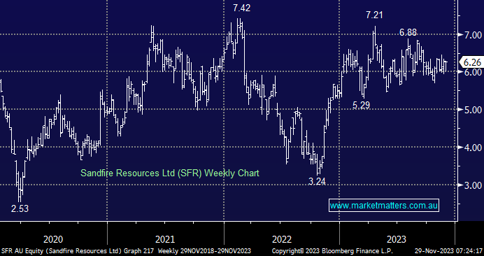 SFR has outperformed the copper price through 2023, benefiting from being the vehicle of choice for copper exposure since BHP’s takeover of OZ Minerals (OZL). While we don’t regard it as the same top quality as OZL, it is the best local pure copper play and will rise when the industrial metal regains its mojo, something we believe is inevitable through 2024/5 due to good old-fashioned supply and demand factors – We discussed these in our recent Resources into FY24 webinar.