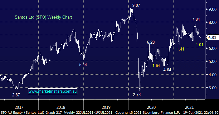 Oil was smacked over 7% last night which sent the US Energy Sector down -3.6%, we’ve been stalking Santos (STO) for many weeks with an ideal entry below $6.50 which may easily be achievable this morning. Again we are considering buying 3% for our Flagship Growth Portfolio leaving room to average if further weakness unfolds in-line with our index thoughts.