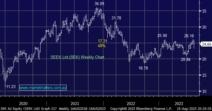 That said, this is a quality business that continues to operate well despite the external challenges, the company’s platform unification program has progressed well with all software development for the re-cut online marketplace now completed on time, with November the targeted month for rollout. Analysts largely like the stock with 8 buys, 3 holds and 2 sells, we are in agreement with them from a business perspective but the main variable is the economy into 2024. The key softness in yesterday’s numbers was around FY24 guidance which we believe is prudent on their part as economic activity is outside of their control – potentially under-promising and over-delivering if the Goldilocks scenario does unfold in the global economy.