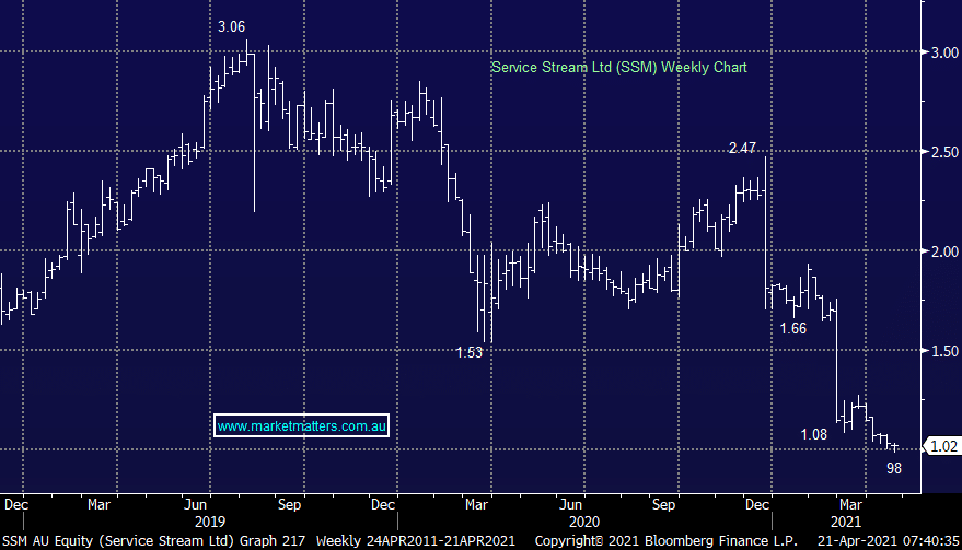One potential catalyst in the near term is winning work under the NBNs upgrade program in the coming months while the team at Bells believe that M & A is also on their radar. They have a net cash position (i.e. no net debt) however there is some risk around the dividend given weakness in earnings this year. Now the stock has dipped below $1, we think too much pessimism is priced in and we are considering adding to the position, rather than cutting it.