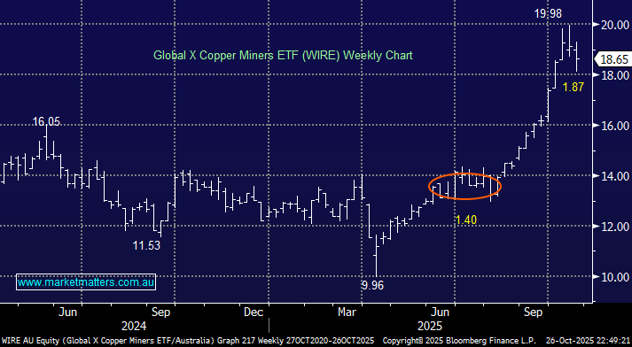 The WIRE ETF bounced last week after correcting more than 9%, even as the copper price pushed towards new all-time highs. The copper sectors run hard, but we believe the trend has further to play out, potentially this side of Christmas.
