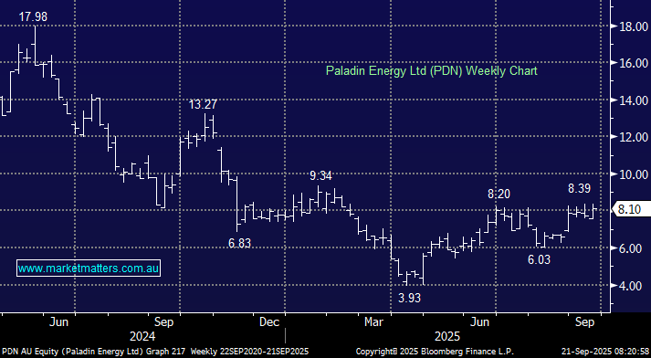 Global Uranium stocks posted fresh 2025 highs last week, and PDN in particular looks poised to break out, above the $8.40 resistance area. The $300mn capital raise at $7.25 earlier in the month has weighed on PDN in recent sessions, but the stock is already trading more than 10% above the raise, illustrating strong support below $8. It feels like a quick, sharp ~25% rally towards $10 is around the corner.