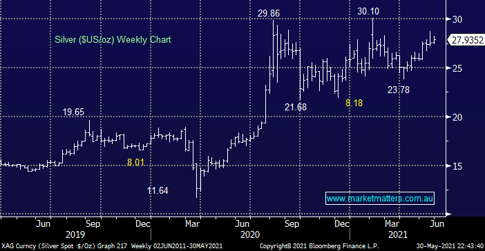 Precious metals have rallied steadily from their early April low with silver edging up towards its 2021 high. The short-term direction of the complex is likely to be determined by the $US but we remain bullish medium-term believing a break to fresh highs is a matter of time.