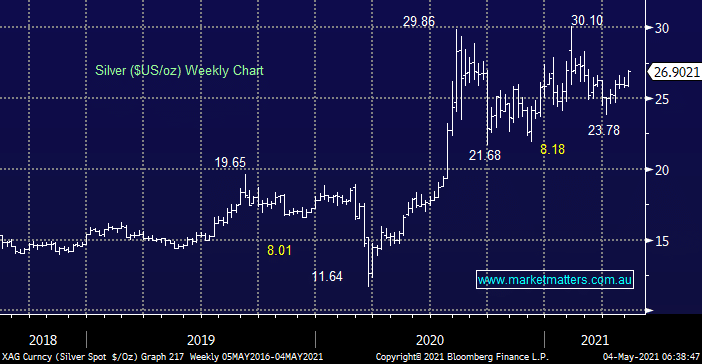 The market move which especially caught my attention overnight was in silver & gold with the former closing up almost 4%, at fresh 10-week highs, following only a small pullback by the $US. We remain bullish silver looking for at least another 10% upside.