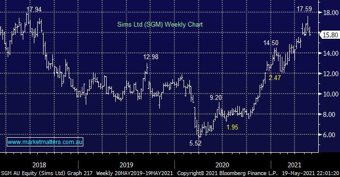 Another stock in the materials space to fall ~4% yesterday was recycling business SGM which is now already 10% below last week’s high, the risk / reward will start to look attractive around the $15 area but a deeper correction wouldn’t surprise in today’s volatile environment, especially if the $US bounces as it did overnight following the Fed minutes.