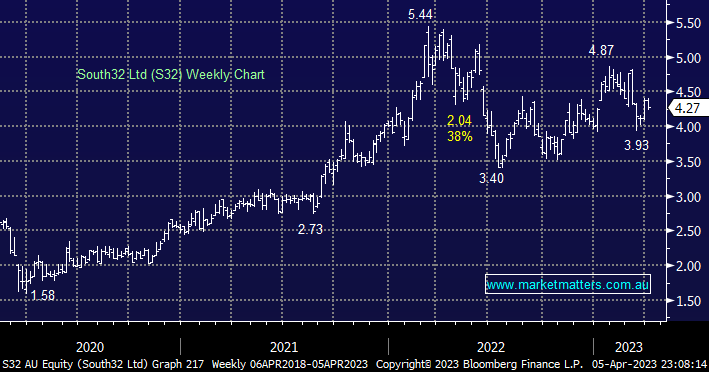 - We are considering accumulating South32 into any weakness around/ below the $4 area.