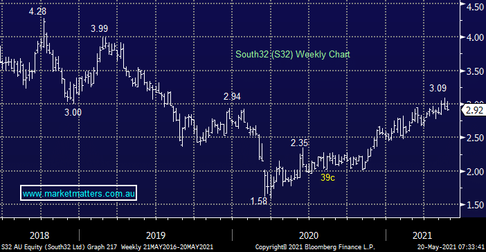 S32 is another Australian miner that MM likes but at lower levels, in this case the diversified miner will look great if we see a further 10% decline, again not out of question considering the stock fell 4% yesterday.