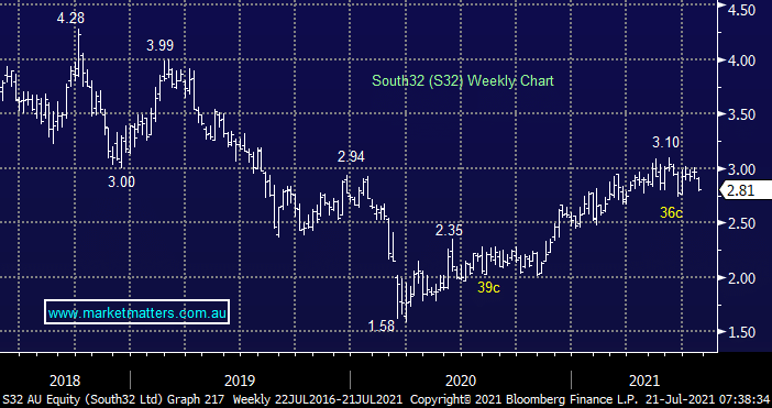 This isn’t always the easiest stock to value with so many moving parts but it’s in the sector we like and the technical risk / reward picture is excellent, another ~4% lower and S32 will enter our “buy zone” – yet another stock / market we like 4% lower.