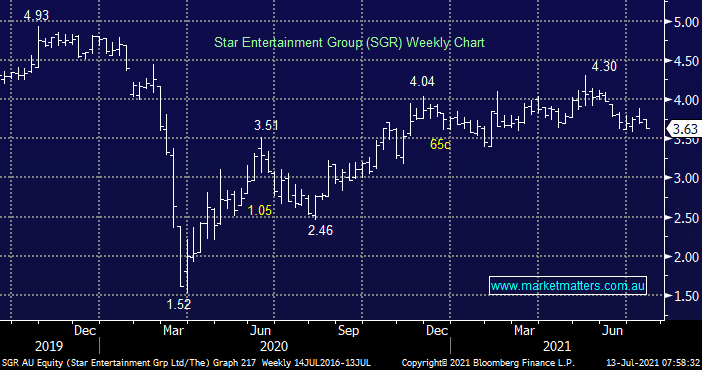 Casinos are certainly “on the nose” at the moment with Crown (CWN) being taken to task by the regulators, its not pretty reading but we do believe it will emerge a stronger business moving forward, similar to the banks after their royal commission which also made awful reading. When you combine regulators after their pound of flesh and COVID closing premises things do look dire but they usually do at the best buying opportunities, MM likes SGR into weakness ~5% lower.