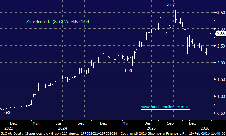 SLC +18.18%: Superloop delivered a strong 1H result and upgraded full-year underlying earnings (EBITDA) guidance, driven by continued customer growth and market share gains. The business is scaling quickly, with momentum expected to build further into FY27 as acquisitions contribute.