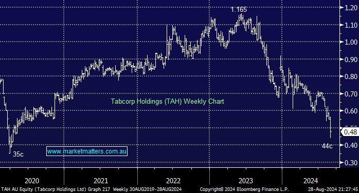 TAH was whacked 15% on Wednesday after delivering an FY24 earnings miss and weak guidance that it expects soft market conditions to continue. There were some positives, such as the company securing a new 20-year Victorian Wagering and Betting Licence and progress in upgrading its retail venues. Still, these were outweighed by the company’s struggles in the digital space, with revenue down 2.2% for the year. TAH still looks and feels like an old-fashioned “dinosaur-like” business falling ever further behind in the growth area of its marketplace.