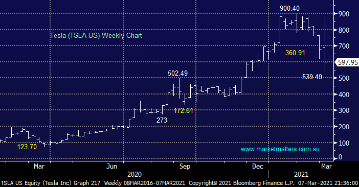 The more growth and potentially irrational exuberance that growth stocks have enjoyed in recent times the harder they’ve been smacked, previous market darling Tesla (TSLA US) has become a huge underperformer falling 40% in a handful of weeks to actually close on Friday down 15% for the year. While we can see a decent bounce in the coming weeks I feel TSLA’s going to struggle to breach $US900 in 2021 which reminds me of other high beta market candidates like Bitcoin and the local BNPL space, investors should remember our view that 2021 will be “tough for those not prepared to press their sell buttons”.