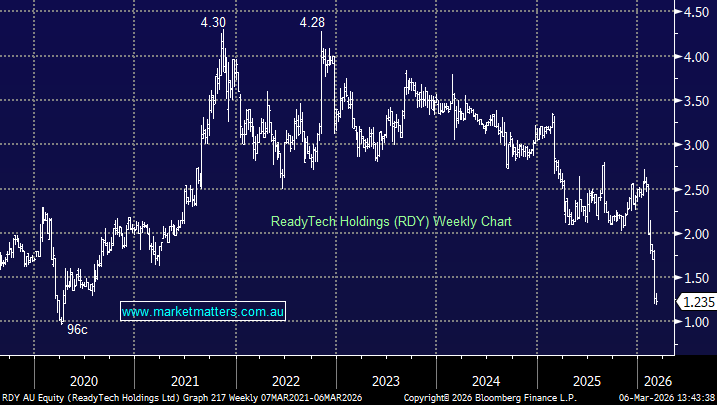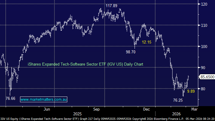 Our favourite ETF to get an insight into the volatile US software sector advanced another +1.8% overnight but we’re not ruling out a final washout of the battered sector, whether as a consequence of the Middle Easter conflict, &/or another AI disruption story that sees investors “sell first, and ask questions later.” We are comfortable with our call that the sector is “looking for a low” for at least 2026, but we’re still 50-50 as to whether another leg down is required to reach peak bearishness.