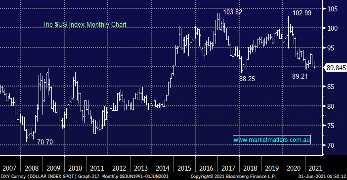 The $US index again dipped back under 90 overnight helping support commodity prices although their gains were muted which is to be expected on a holiday. The trend is clearly down since the peak of the pandemic panic in financial markets in Q1 of last year but interestingly the $US is only back to its support area of early 2018.