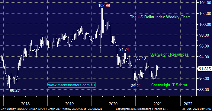 The $US has been drifting since its strong bounce last week, price action which has led to some ongoing rotation between the likes of tech, resources and banks. Our plan remains to lighten our tech exposure into such a $US advance and reweight back towards the resources but at the moment this influential  FX factor on sector performance is in no-man’s land.