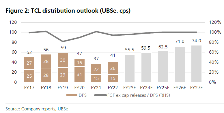 On UBS estimates, we have cycled the low point in yield from Transurban (TCL) and by FY24 the yield will be back up above pre-covid levels and will rise steadily from there.