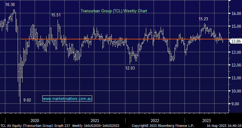 TCL -0.72%: The toll road operator reported FY23 results that were a touch light on. Proportional EBITDA of $2.448m was ~2% below consensus while the dividend of 58cps had already been announced. For FY24, they expect distributions of 62cps (v 62.5cps consensus), but they mentioned this was likely to include WestConnex cash previously held during construction (which is 3-4cps), which implies a softer underlying result, although worth bearing in mind, they like to upgrade distribution guidance through the year and this could give some ammunition to do that. While debt is high, it’s 96% hedged as you’d expect while inflation-linked tolls should also help with top-line growth. TCL also announced a new CEO, the impressive Michelle Jablko to take the reins from retiring CEO Scott Charlton.