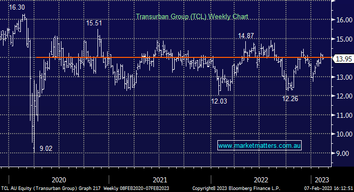 TCL -0.57%: A good 1H23 result this morning for the toll road operator, with EBITDA for the half of $1.24bn, above the $1.09bn expected while the distribution of 26.5c is a small beat (exp 26c). Funding costs were better than expected and Transurban has been proactive in hedging their interest rate risk with 94% of their debt book hedged for the short term. They also increased distribution guidance for the full year to 57c, up from prior guidance (and consensus) of 53c, amid record traffic across both the Sydney & Brisbane markets. Melbourne traffic remains below pre-COVID levels, however the trend is improving with the December quarter traffic -6% vs -8% in the September Quarter. The resignation of Chief Executive Scott Charlton after 11 years behind the wheel was also taken as a negative by the market and was the main reason for pressure on shares today, alongside the RBA hike.