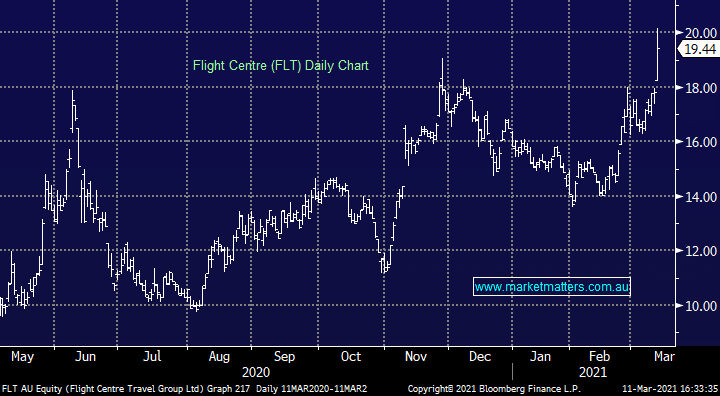 A day in the sun for travel stocks with Flight Centre (FLT) +9.21%, Corporate Travel (CTD) +4.33%, Webjet (WEB) +3.75%, QANTAS (QAN) +2.51% & Sydney Airports (SYD) +2.15% after The Federal Government announced a $1.2 billion tourism support package aimed at supporting local travel while international routes remain off limits. This included a basket of airline ticket subsidies for travelers, cheap loans to small tour companies and financial support ($200 million/) for Qantas & Virgin to bring planes back online, plus a bunch of other measures. Flight Centre the major beneficiary here however important to recognize that FLT’s market capitalization ($4bn) is now only ~30% below it’s all time high ($6bn) when shares were trading above $60 given the huge, dilutive emergency capital raise during the pandemic. In other words, we view this as a rally to sell.