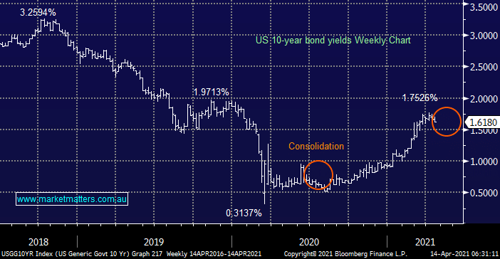 US bond yields continue to consolidate close to both their 2021 and 2-year highs, no surprise to MM although they are a tad higher than we called a few weeks ago. Stocks have confirmed our supposition that it was the speed of their ascent as opposed to the actual level reached that rattled growth names such as XRO. At this stage, another test higher remains a possibility before ongoing further calm ensues but we see US yields below 1.5% this quarter which remains good for growth names but a definite headwind for banks and other value names.