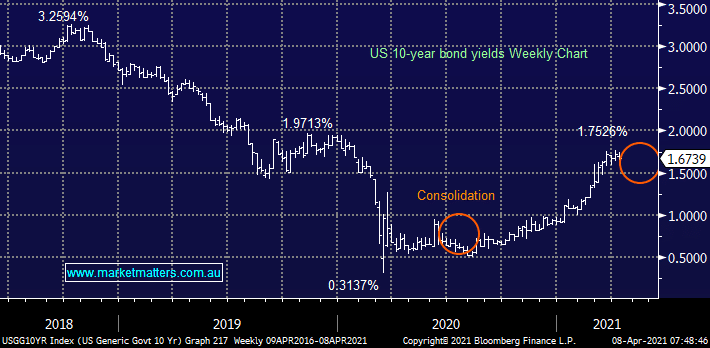 US bond yields continue to follow MM’s preferred path for a period of consolidation. After hitting 1.75% the US 10 year yield has now drifted back to 1.67%. While we expect yields to take a breather here, ultimately we expect interest rates to track higher inline with our reflationary expectations.