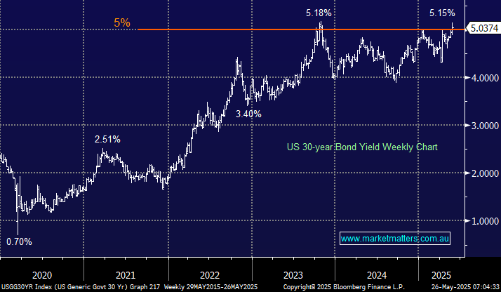 Investors face yet another bumpy start to the trading week, although attention is focused on mounting concern over US debt, which is driving long-dated bond yields higher. However, when we stand back and look at the US 30s, they have been trading between 4% and 5% since mid-2023. Although Trump 2.0 is understandably pushing yields to the top end of this trading band, we don’t believe it’s going to propel them to a new level of equilibrium unless the $US unwinds dramatically on the downside.