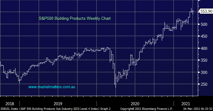 When we cast our eye to the US Building Sector the picture remains very healthy with the Building Products Index shown below up over 100% from its COVID March low. The huge combined tailwind of massive economic stimulus and almost free money provides a bullish outlook for building through 2021.