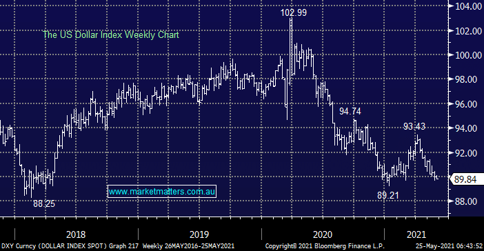 The $US Index continues to test its 2021 lows although the $A struggles to break above 78c, overnight the commodities bounced on the declining $US with copper recovering +1.2% and precious metals marginally higher. If we are correct and the $US is “looking for a significant low” then more downside for the resources space is very likely in the coming months.