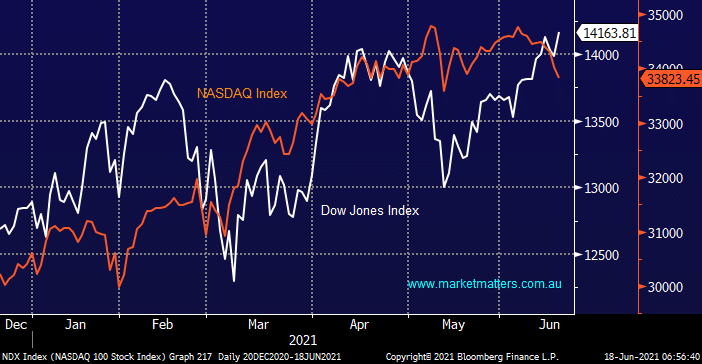US stocks have largely enjoyed a strong 2021 but the last month has seen some major outperformance from the tech end of town with the NASDAQ rallying ~9% while the Dow Jones has trod water with the drift lower in bond yields the main tailwind for the disparity in our opinion.