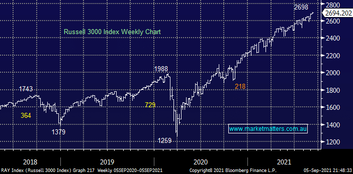 US stocks continue to grind higher with no sell signals in-sight and although most of the heavy lifting is being done by the mega-cap tech stocks the broad based Russell 3000 Index still continues to post fresh all-time highs with almost boring monotony. Similar to the local market we are keen buyers of pullbacks by US stocks but 2nd guessing when such a move against the trend will occur is an unnecessary and dangerous “game”.