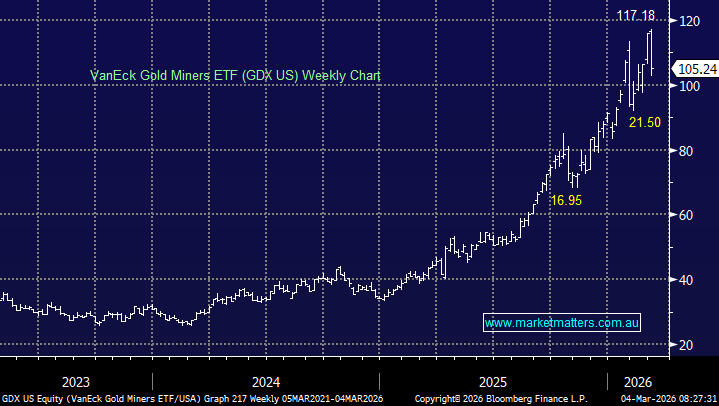 Gold miners were smacked overnight as precious metals reversed sharply lower when many would expect and were positioned for higher prices – long gold has been one of the most crowded positions over recent months. The GDX gold miners ETF closed down ~9% with the miners not bouncing with the broader US market. Considering the large “long” gold position across global markets and the disappointing reaction overnight for the bulls, we can see a similar style washout unfolding to the one experienced in February.