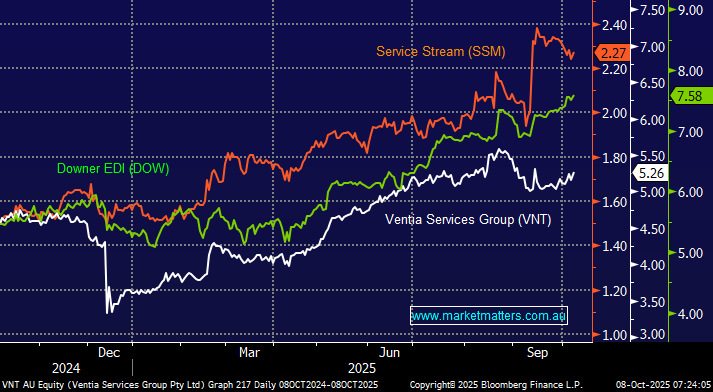 Having established we like VNT, the next obvious question is why not buy the slightly larger DOW, with both stocks up between 44 and 46% in 2025. They are both trading on a very similar valuation, with DOW also executing a buyback, although VNT does yield slightly higher. We prefer VNT due to their primary revenue mix of defence, utilities and telco as opposed to DOW’s current transport bias. We also think DOW has already “squeezed the orange” in terms of cost savings and divestments.