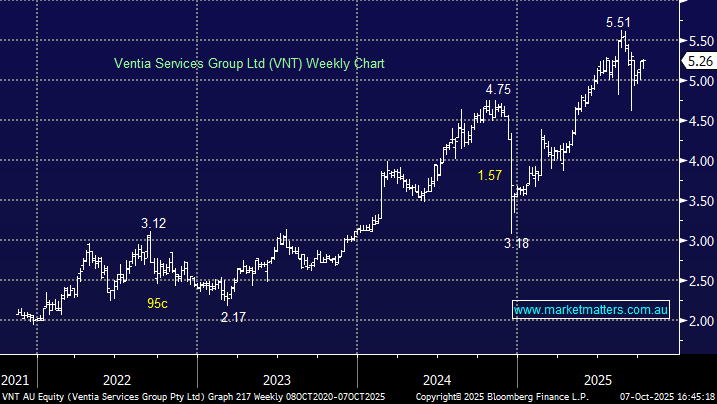 VNT is a $4.4bn infrastructure services provider, operating in Australia and New Zealand. It manages, operates and maintains critical public and private assets, including telecommunications, defence bases, energy networks, water systems, and road & rail infrastructure. Before listing in late 2021, it was jointly owned by CIMIC Group (formerly Leighton Holdings) and private equity firm Apollo Global Management and operated under the “Leighton Services” brand. So far, the stock has rewarded investors in 2025, advancing close to 50% tracking revenue, which has risen steadily from $4.6bn in 2021 to an Est. $6.2bn in 2025.