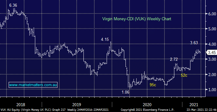 VUK is one of our top picks for 2021 but its already up 45% year to date and it feels like its tiring as it heads towards our $4 target area. This is high Beta banking position which by definition can be expected to fall harder than the underlying sector when it does correct.