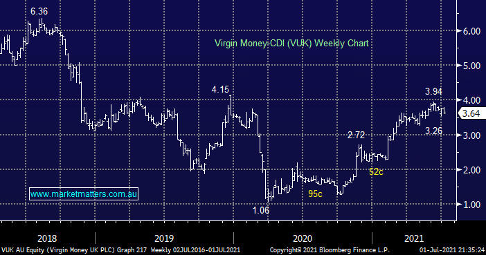 UK based VUK has been the best performing bank in 2021 rallying over 50% but it’s been coming off the boil since bond spreads started to contract following comments from the Fed. In hindsight we took a 30%+ profit too early back in February but we still believe the opportunity to re-enter VUK at lower levels will present itself in the coming months.