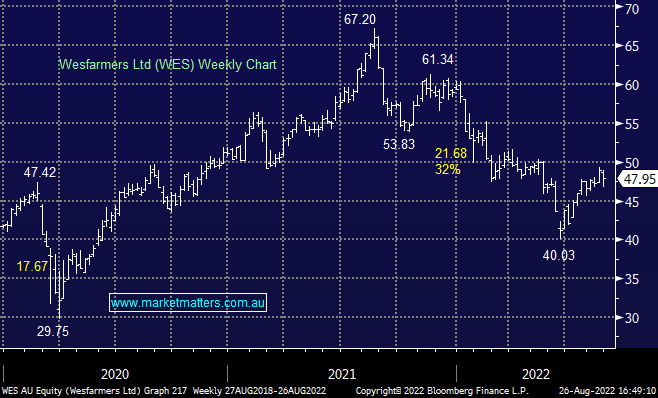 WES +0.65%: A better than expected FY22 results from Wesfarmers today with all key metrics coming in ahead of consensus expectations with net profit after tax around a 5% beat. While FY22 profit was down 1.2% on FY21, that was a result of a tough 1H with 2H earnings growth of 13.1% showing a strong rebound. The 2H dividend of $1 was a beat and while no guidance was provided, which is customary for WES, they talked to positive trends playing out at the start of FY23. The vibe we got from today’s conference call was all positive and quiet the opposite to what we had with both Woolies & Coles this week.