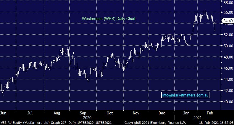 Wesfarmers (WES) +0.63%: first half result was a beat to the market with profit up 23% at $1.4b ahead of consensus at $1.2b. The dividend rose with the profit, climbing to 88c. No doubt the first half was assisted by a positive retail market with each of Wesfarmer’s main brands caching a sales tailwind. Bunnings LFL was up 27.7%, Kmart and Target were up 9.1% and 13% respectively while Officeworks 23.4% higher. The company did note that LFL growth had started to revert towards long term averages into the end of the calendar year and is “expected to moderate from March” as the comp cycles to COVID lockdowns. WES also have a Chemicals, Energy and Fertilizers (CEF) business which makes up ~15% of the business, which saw EBIT fall 8% largely on commodity prices. They did announce approval on the Mt Holland Lithium projected expected to be up and running for FY22. We like WES, the result is a good one as expected. It’s well run and with plenty of balance sheet fire power.