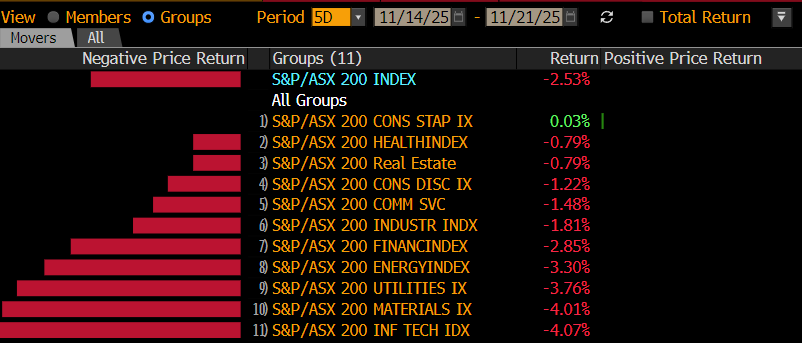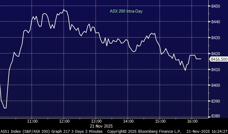 The local market spent the morning stabilising after yesterday’s selloff, with Nvidia’s earnings result tomorrow morning remaining in the focus. Strength across energy, gold and defensive names helped the market keep its head above water for most of the session, until softness prevailed into the close as investors took risk off the table with a volatile session likely in store for tomorrow.