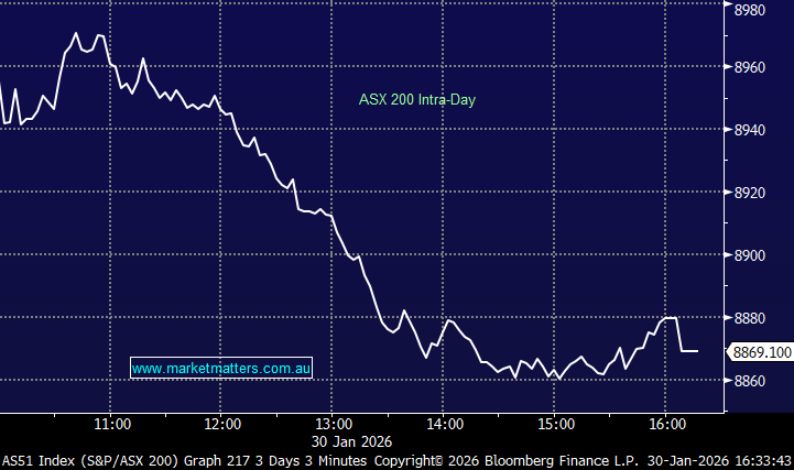 • Gold equities sold off hard as spot gold fell ~US$170/oz during the session, trading ~$US5200/oz having been trading just below $US5600/oz overnight.