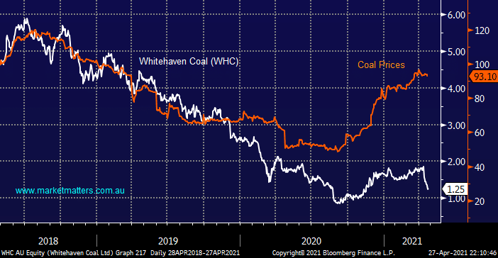 One “buy” catalyst which would catch our eye would be a few bad days for coal which WHC basically shrugged off, it would be a great indicator that the short-term selling had washed through – we feel the elastic band between the coal price and WHC has stretched too far.