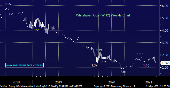 MM was caught out by WHC’s poor update last week but after exerting some patience we like the risk / reward below $1.40, we believe that a correction of ~27% is overdone even after another disappointing report, it’s basically factoring in the worst case scenarios plus some. Arguably the biggest short-term  issue was the market was caught long but now we’ve experienced a major washout the valuation looks attractive, it maybe 2022 until WHC gets to show some fundamental improvement but markets do tend to look at least 6-months ahead – prior to the update broker upgrades were coming thick and fast e.g. targets for Bell Potter of $2.35 & Goldman Sachs $2.20.