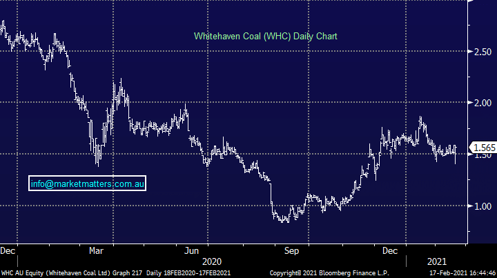 Whitehaven (WHC) -1.26%:  Clawed its way back from some early selling, the headline $90m NPAT loss for the half was a touch worse than expected but the company defended its position well in the investor call and clearly, this half was the bottom point of the cycle. Management did well managing costs which meant EBITDA managed to stay in the green. They talked up growth projects and their ability to pay down debt on the call as coal prices have rebounded strongly from the lows. Just $37m of EBITDA in the first half could turn into $500m+ in the second based on spot.
