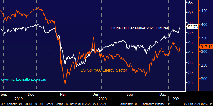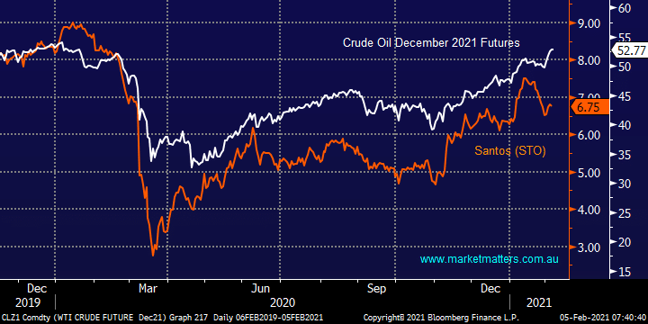 The recent underperformance by oil stocks compared to the underlying commodity price is not an Australian phenomenon as can be seen from the chart below which looks at the US Energy Sector, it’s almost identical to Santos (STO). Notably the US sector remain well below its’s mid-2020 highs, a level we believe will be surpassed this year.