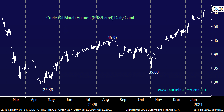 March crude futures closed above $US56/barrel overnight while the December contract closed just below $US53, not major backwardation but still an indication the market believes prices will be lower late in the year.  If nothing else this is another example that investors must be prepared to sell strength when it gets too extreme in 2021 if they want to outperform.
