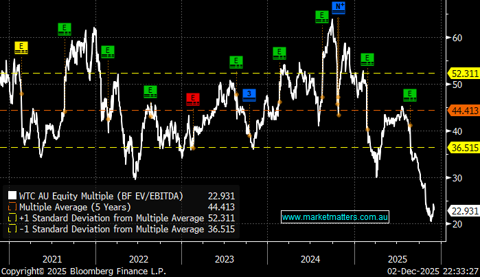- WTC is trading ~48% below its 5-year average EV/EBITDA multiple – i.e. it’s as cheap as its ever been.